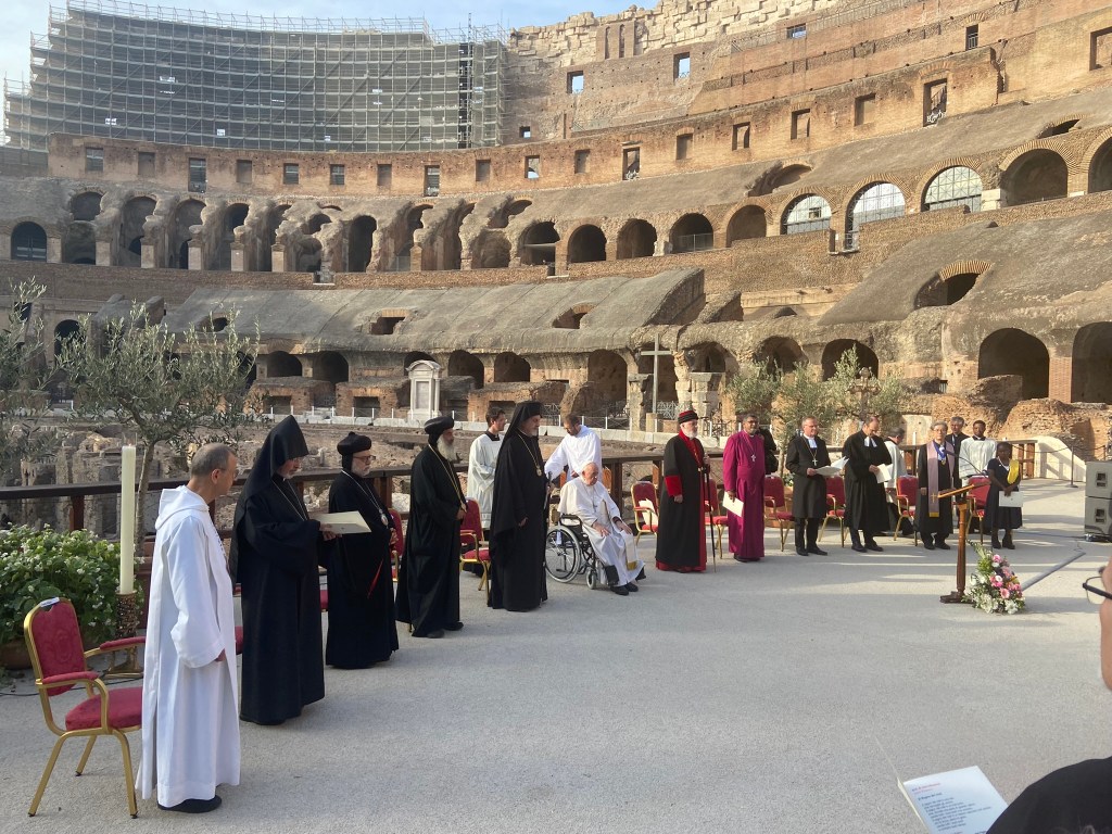 On the morning of Tuesday, 25 October, the Sant’Egidio International Meeting of Peace continued, with Prof Park and Rev Laferty attending. Ms. Kingston was unable to extend her trip to attend the proceedings on Tuesday and returned home. Rev Dn. Alessandra Trotta, moderator of the Waldensian Evangelical Church, also joined the Methodist delegation. Following lunch, Prof Park and Rev Laferty were joined by Rev Luca Anziani, president of the Methodist Churches in Italy, at the Colosseum for Christian prayers for peace as organized by the Sant’Egidio Community. Prof Park was among a small group of senior church leaders from various Christian confessions to lead the prayers alongside Pope Francis. Prior to the prayers, Pope Francis personally greeted Prof Park. After the prayers, the delegation joined other leaders from various religious traditions for the closing ceremony of the Sant’Egidio International Meeting of Peace. A special dinner was held in the Palace of Exhibitions in central Rome for invited participants.