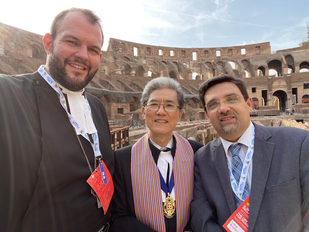 On the morning of Tuesday, 25 October, the Sant’Egidio International Meeting of Peace continued, with Prof Park and Rev Laferty attending. Ms. Kingston was unable to extend her trip to attend the proceedings on Tuesday and returned to Ireland. Rev Dn. Alessandra Trotta, moderator of the Waldensian Evangelical Church, also joined the Methodist delegation. Prof Park met Rev Ki-seok Hong and Rev Jong Kim, pastors of the Korean Methodist congregation in Rome, accompanied by Rev Laferty and Ms. Gabuyo, for luncheon to learn about the ministry of the Korean Methodist congregation and the broader Korean-language Methodist work in Italy. Following the luncheon, Prof Park and Rev Laferty were joined by Rev Anziani at the Colosseum for Christian prayers for peace. Prof Park was among a small group of senior church leaders from various Christian confessions to lead the prayers alongside Pope Francis. Prior to the prayers, Pope Francis personally greeted Prof Park. After the prayers, the delegation joined other leaders from various religious traditions for the closing ceremony of the Sant’Egidio International Meeting of Peace. A special dinner was held in the Palace of Exhibitions in central Rome for invited participants. The Methodist delegation was seated with brothers of the Taize Community and engaged in a rich conversation of the importance of outreach to young people and trends among this demographic.