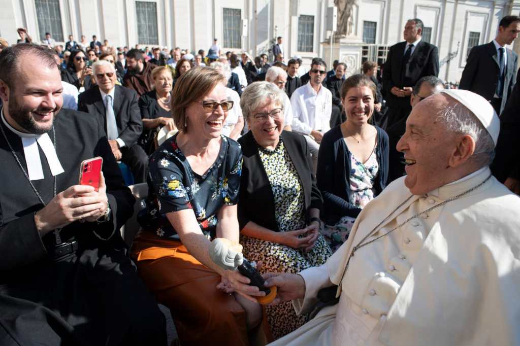 Pope Francis meeting Ms. Gillian Kingston (center) and Rev. Matthew A. Laferty (right) following the General Audience on 22 May 2024. Photo by Vatican Media. Used by permission.